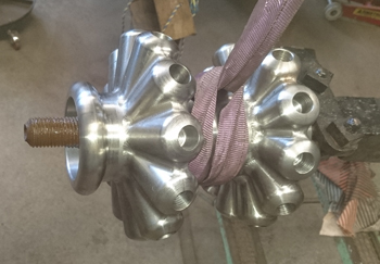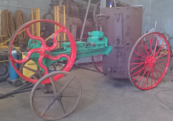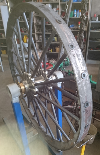 The front wheels had been lost by the time we got the engine. They had been replaced with a pair of much smaller wheels. This left the engine slanting on the wrong angle. The original wheels had been made with spokes cast in but the foundry would not do this so we had a drawing made and got matching hubs CNC machined. We then had a rim cast and had special bolts made to form the spokes.